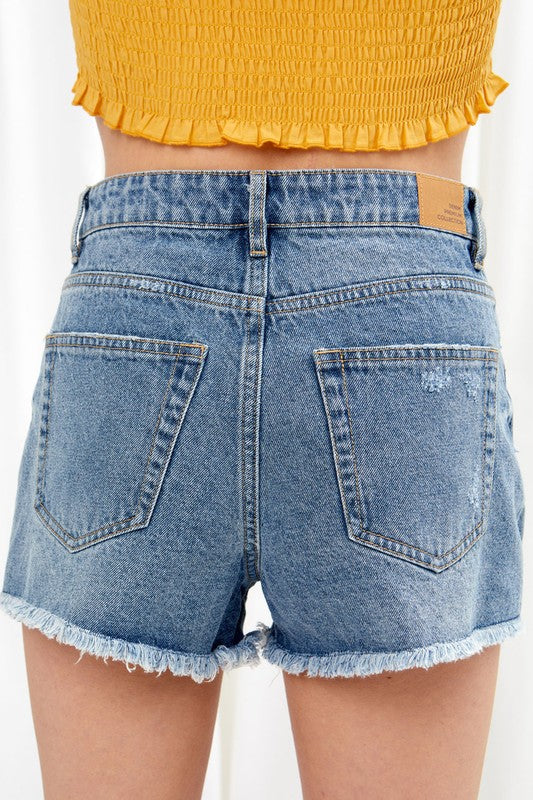 High Rise Denim Shorts with Raw Cuff Hem and Pockets