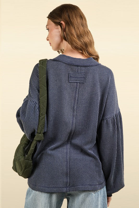 Long Sleeve V Neck Top with Smocked Hem and Tie Detail