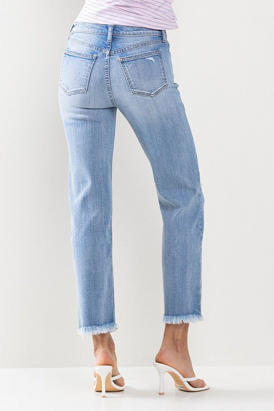 Mid Rise Slim Straight Jeans with Frayed Hem