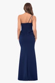 One Shoulder Scuba Crepe Long Formal Dress with Ruching and Ruffle Detail