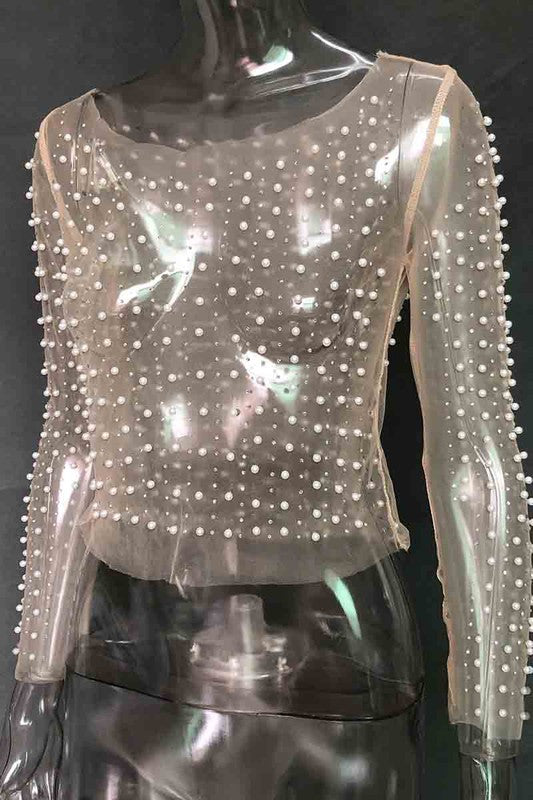 Sheer Long Sleeve Rhinestone and Pearl Top