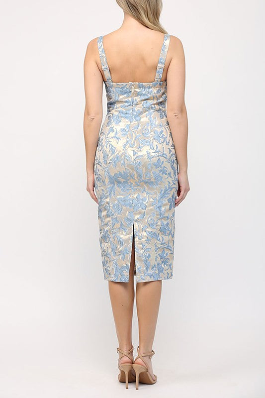 Sleeveless Floral Jacquard Mini Dress with Peep Hole Bodice and Back Slit