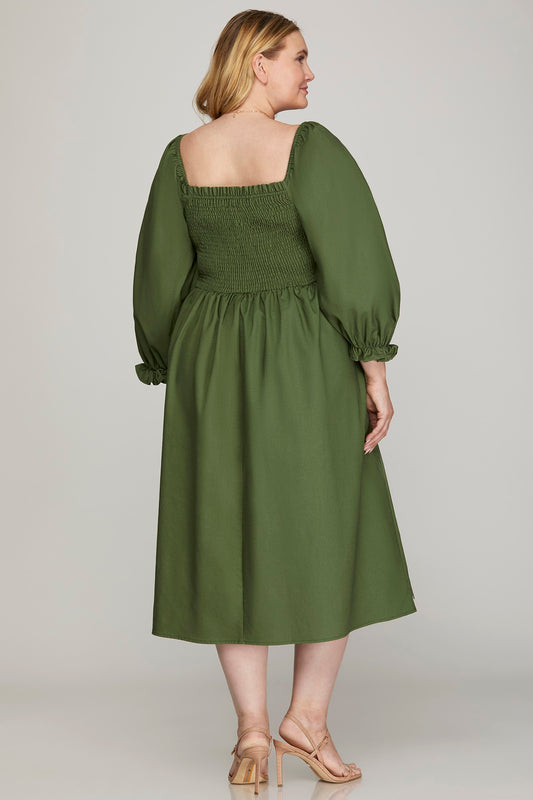 CURVY 3/4 PUFF SLEEVE SMOCKED WOVEN MIDI DRESS WITH POCKETS