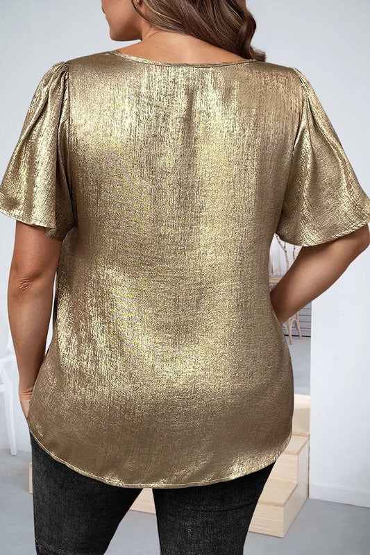 Curvy Butterfly Short Sleeve Woven Print Notched Neckline Top