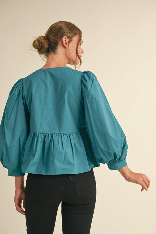 Three Quarter Sleeve Bow Tie Peplum Top with U Neckline