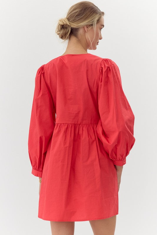 Long Peasant Sleeve Solid Baby Doll Short Dress with Bow Tie Neckline