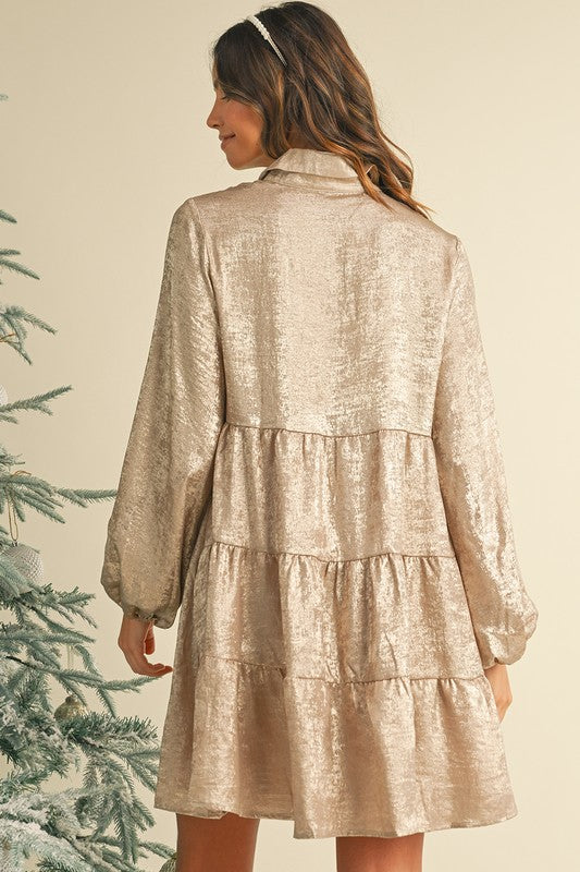 Long Sleeve Metallic Button Down Baby Doll Dress