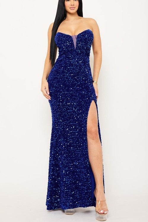 Strapless Sweetheart Neck Sequins Over Velvet Long Formal Dress with Side Slit