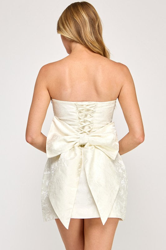 Strapless Satin Jacquard Mini Dress with Back Bow