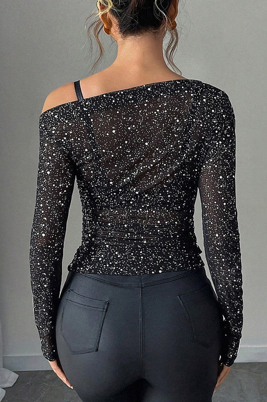 Long Sleeve Off the Shoulder Neckline Glitter Mesh Top