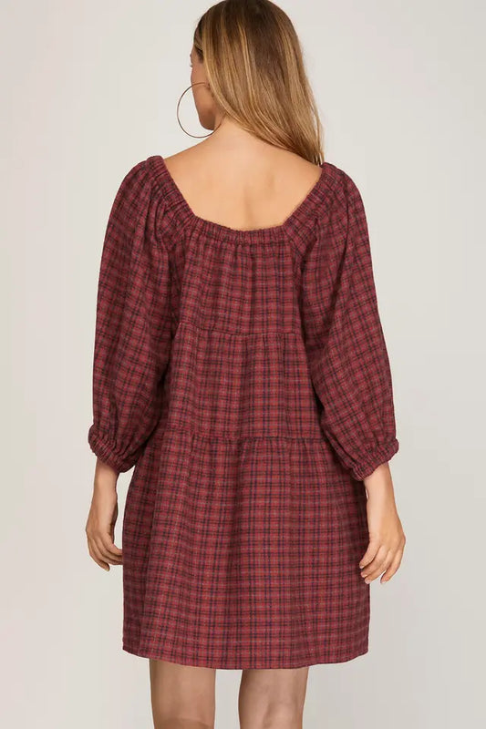 3/4 Sleeve Woven Plaid Tiered Mini Dress with Pockets