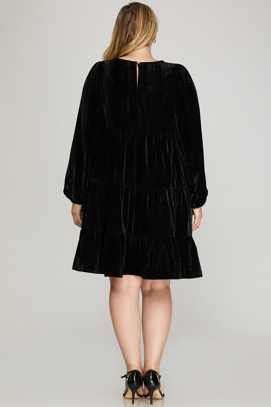 CURVY LONG SLEEVE CRINKLE VELVET TIER DRESS