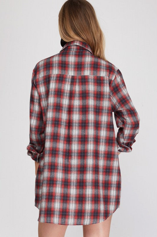 Long Sleeve Woven Plaid Buttondown Shirt with Front Tie Detail