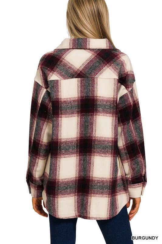 Long Sleeve Boyfriend Yarn Dyed Plaid Shacket with Pockets and Button Front Closure