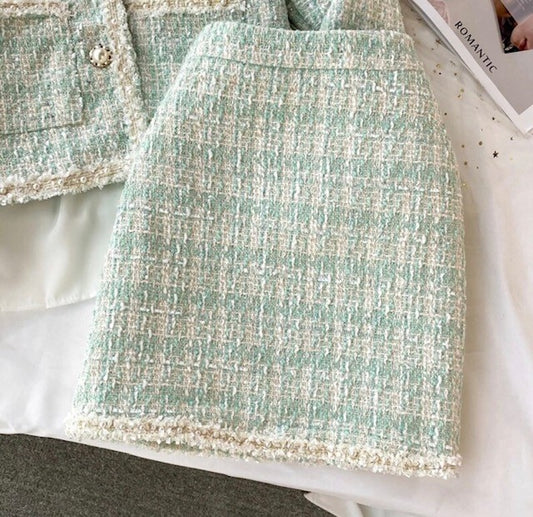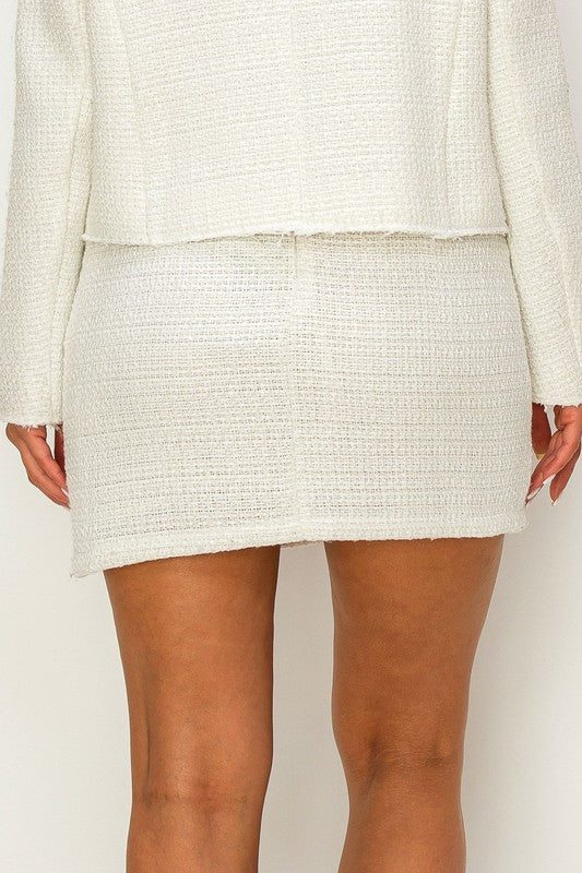 Frayed Edge Button Down Plaid Boucle Mini Skirt
