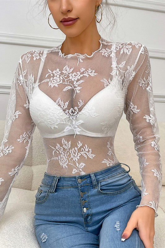 A mesh top with intricate lace details, long sleeves, and a form-fitting