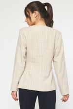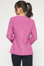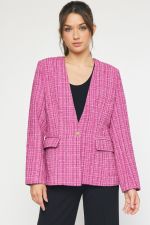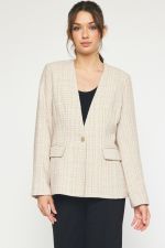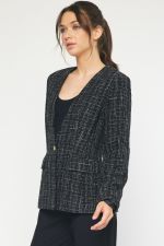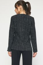 Tweed blazer featuring pockets at front. Button front closure. Lined. Woven. Non-sheer. Mediumweight.