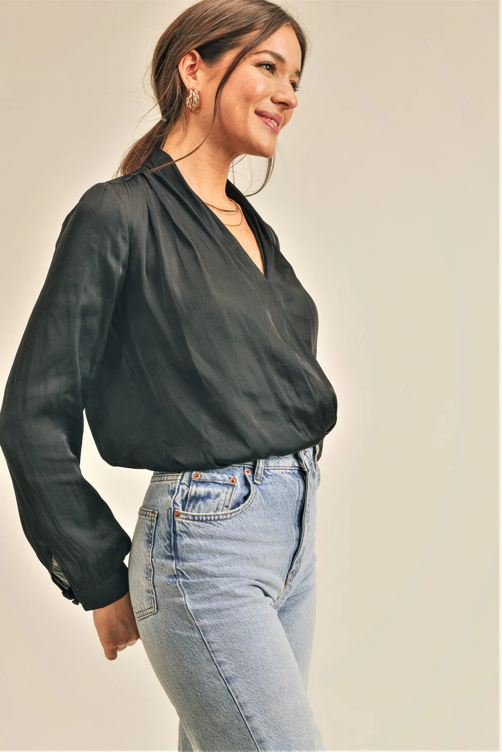 Long Sleeve V Neck Top with Smocked Hem and Tie Detail