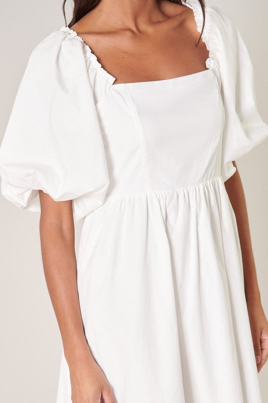 Marion Balloon Sleeve with Smocked and Tie Back Detail Poplin Babydoll Mini Dress