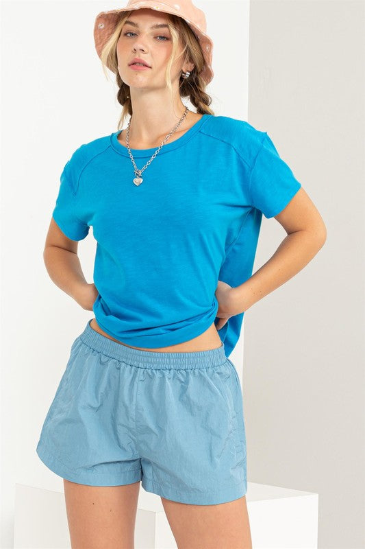ARE ADORNED WITH AN ELASTIC MID WAIST AND A BREEZY SILHOUETTE THAT ALLOWS