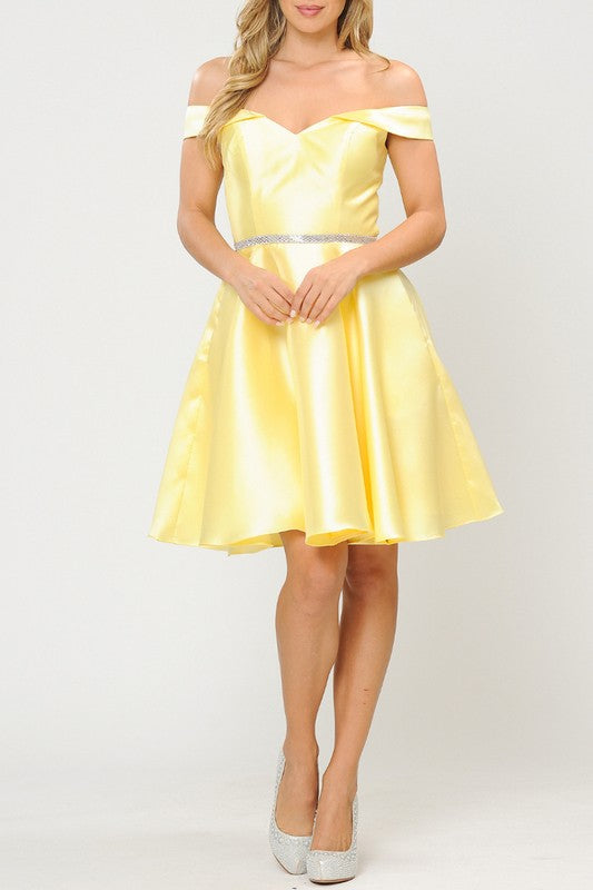Off the Shoulder Fit and Flare Mini Dress with Rhinestone Belt and Pockets