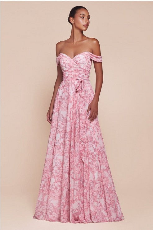 Off the Shoulder Floral Print A Line Long Formal Dress
