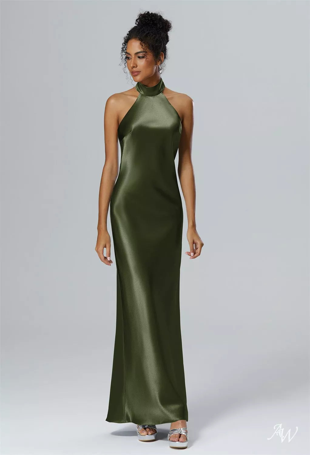 Elevate your wardrobe with this Olive Green Crystal Satin Maxi Dress, expertly crafted for a sophisticated silhouette. The smooth satin fabric drapes gracefully, reflecting light with each movement, while the subtle crystal accents add an understated touch of elegance. Designed to flatter with its flowing maxi length, this dress combines timeless style and refined detail, making it an ideal choice for formal occasions and evening events.