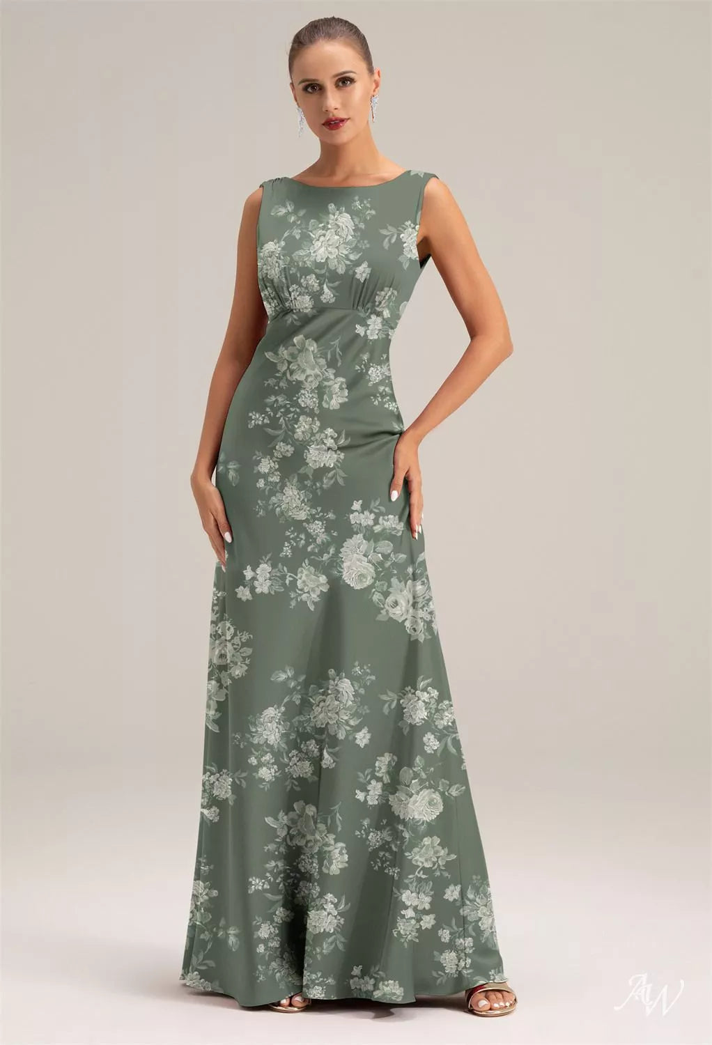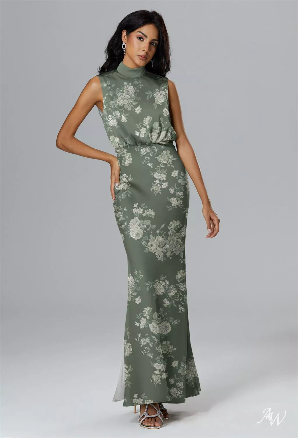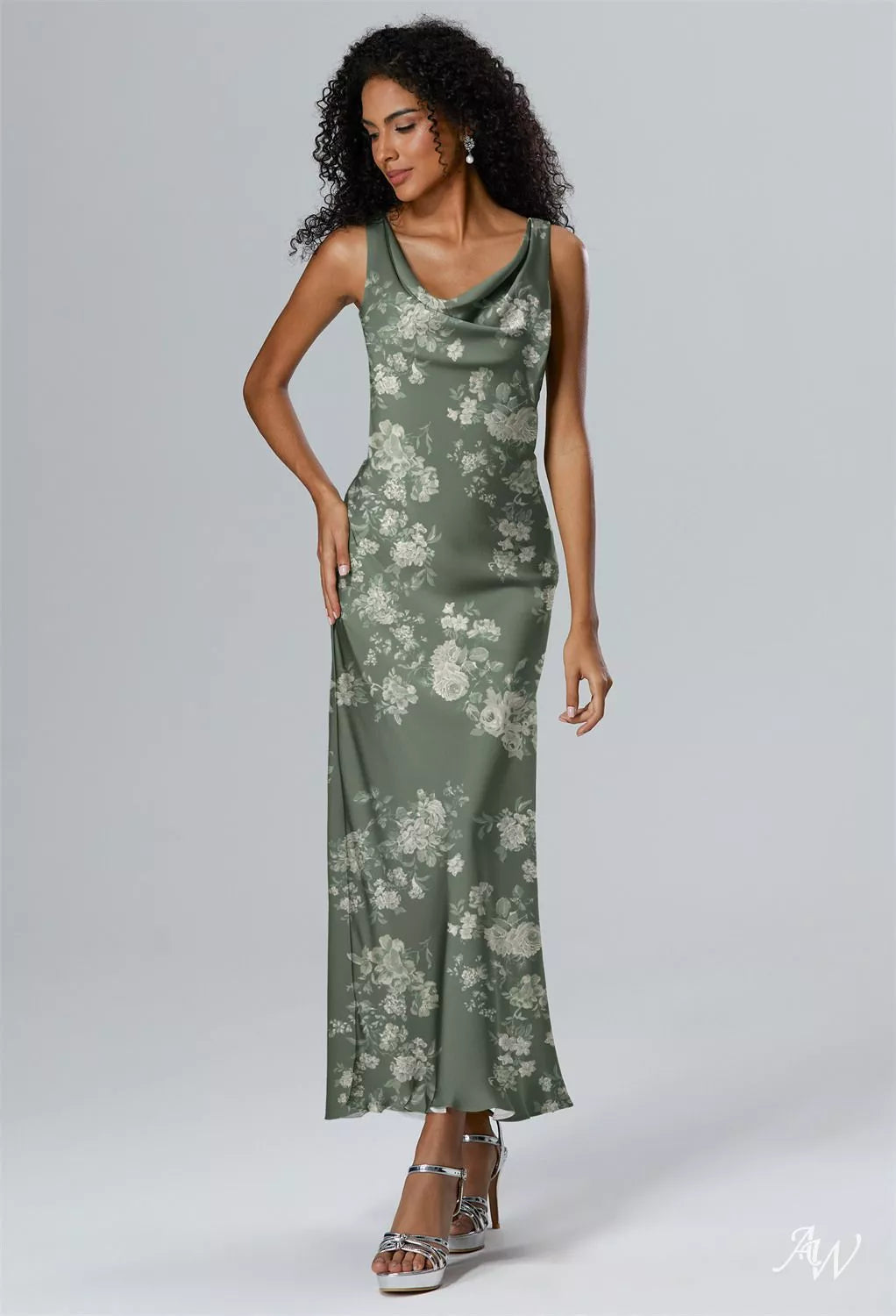 Olive Green Floral Satin Charmeuse Maxi Dress