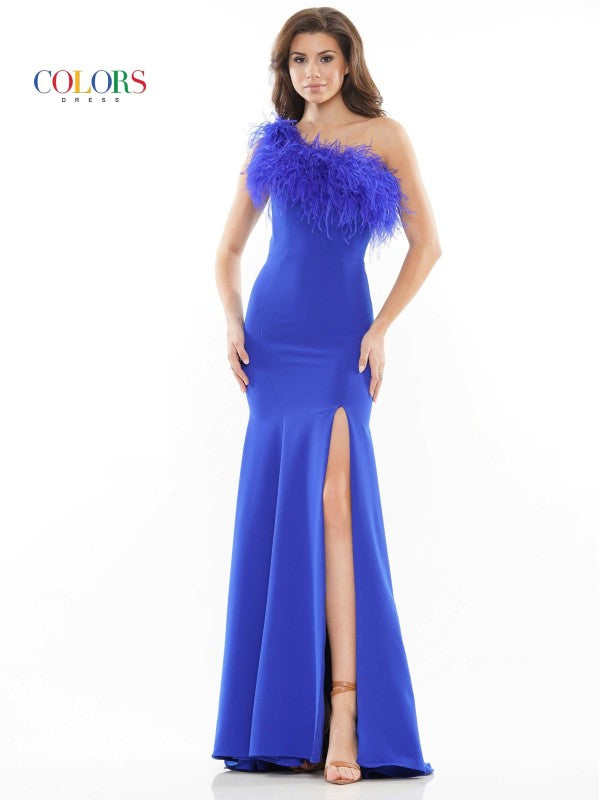 One Shoulder Fit and Flare Long Formal Dress with Feathers at Neckline and Front Slit