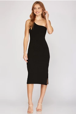 ONE SHOULDER RIB KNIT BODYDON DRESS WITH SIDE SLIT