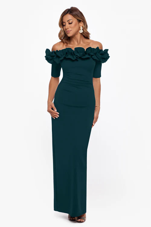 Petite Off the Shoulder Ruffle Scuba Long Fitted Formal Dress with Ruching