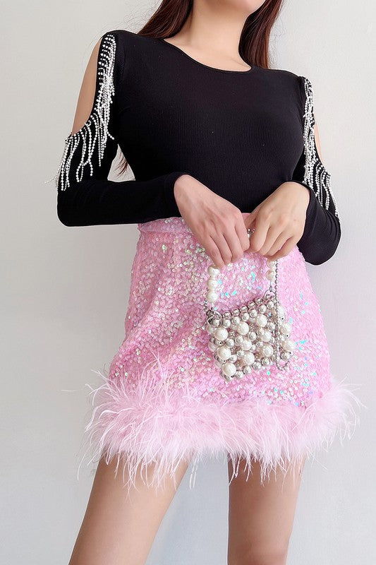 Mid Rise Pink Sequins Skirt With Feather Trim and Elastic Waistband