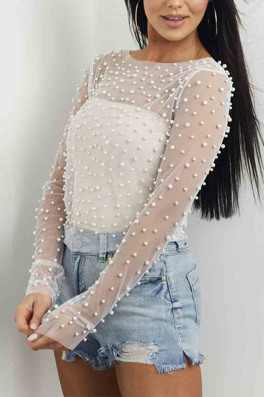Sheer Round Neck Long Sleeve Faux Pearl Mesh Top