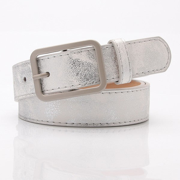 Complete your outfit with the Shiny Alloy Buckle Belt, Featuring a Gleaming Alloy Buckle and a Versatile Design that Effortlessly Enhances both Casual and Formal Attire.