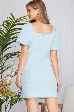 Short Balloon Sleeve Square Neck Textured Knit Short Dress with Zip Up Back Closure