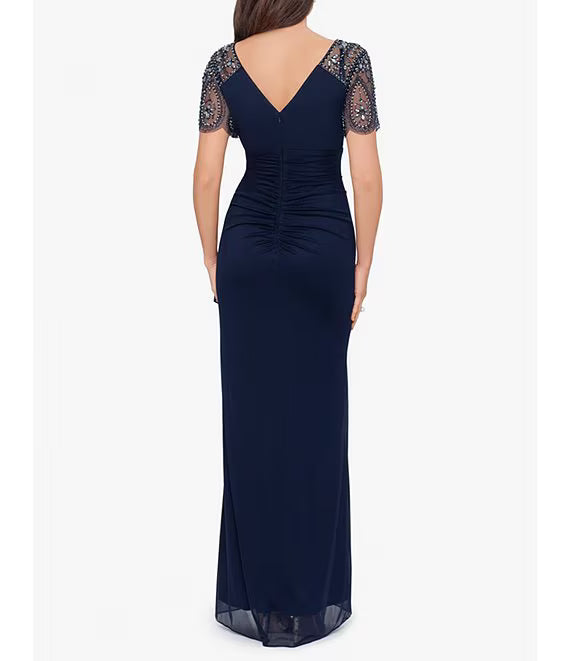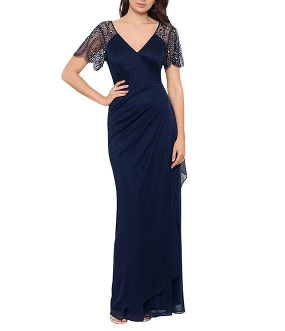 Short Beaded Sheer Flutter Sleeve Cascading Draped Waist V-Neck Beaded Long Formal Dress