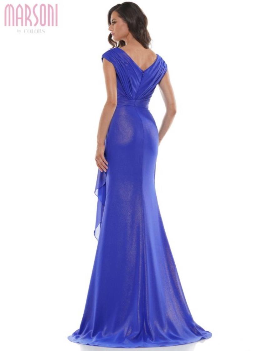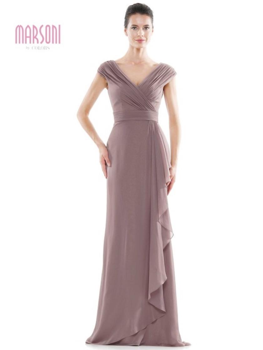 foil chiffon dress with pleated bodice and side ruffle draping.V neck & extended cap sleeve