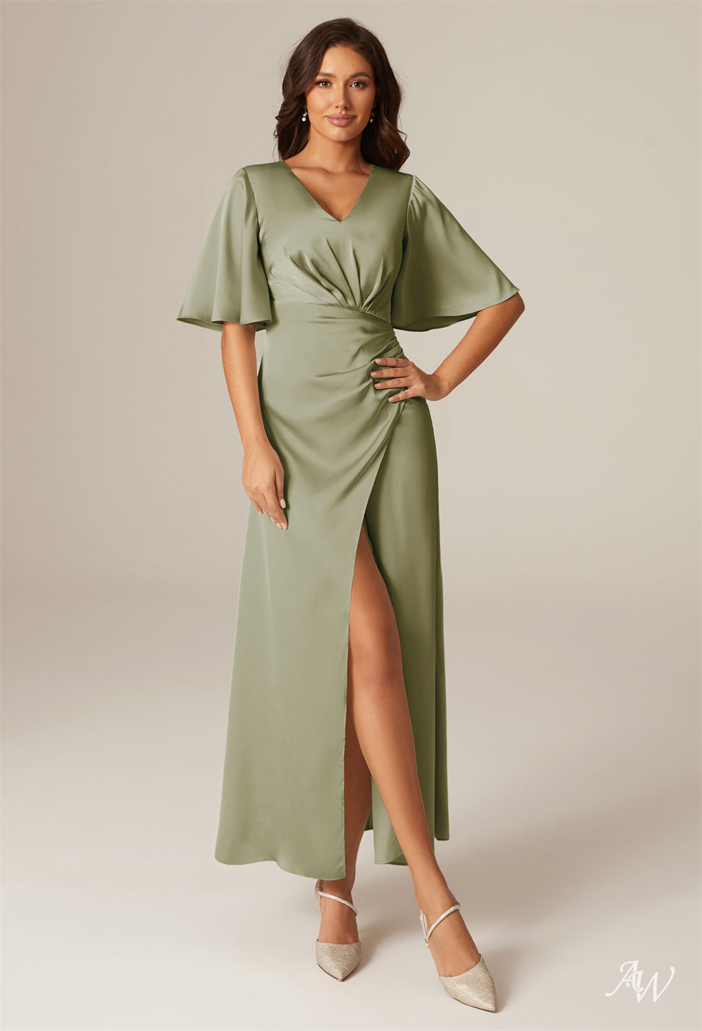 Short Flutter Sleeve V Neck Satin Charmeuse Long Formal Dress with Slit