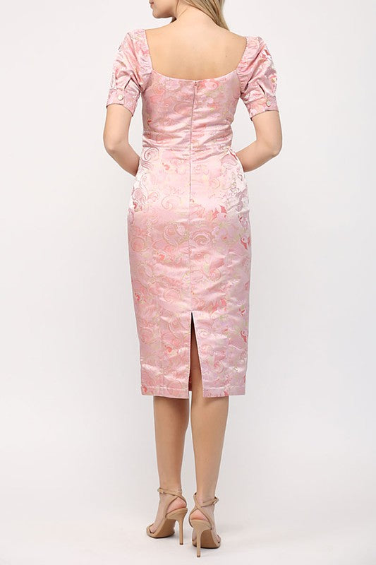 Short Puff Sleeve Floral Jacquard Mini Dress with Back Slit