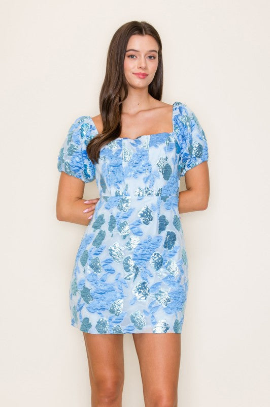 Short Puff Sleeve Floral Jacquard Square Neck Mini Dress