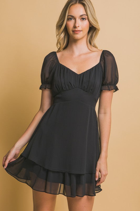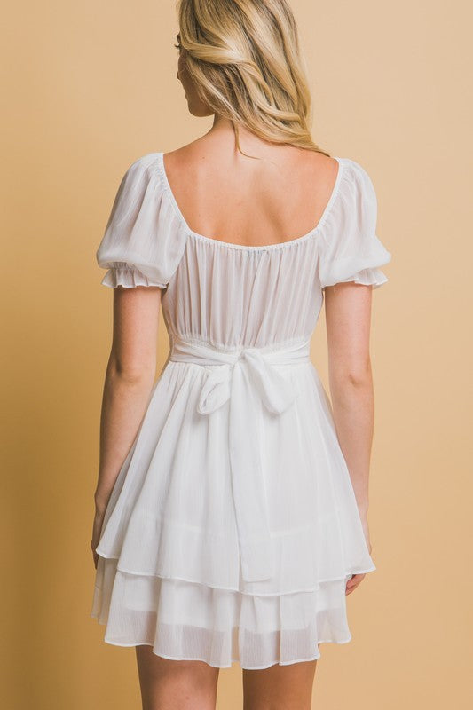 Short Puff Sleeve Ruffle Mini Dress with Bow Tie Back