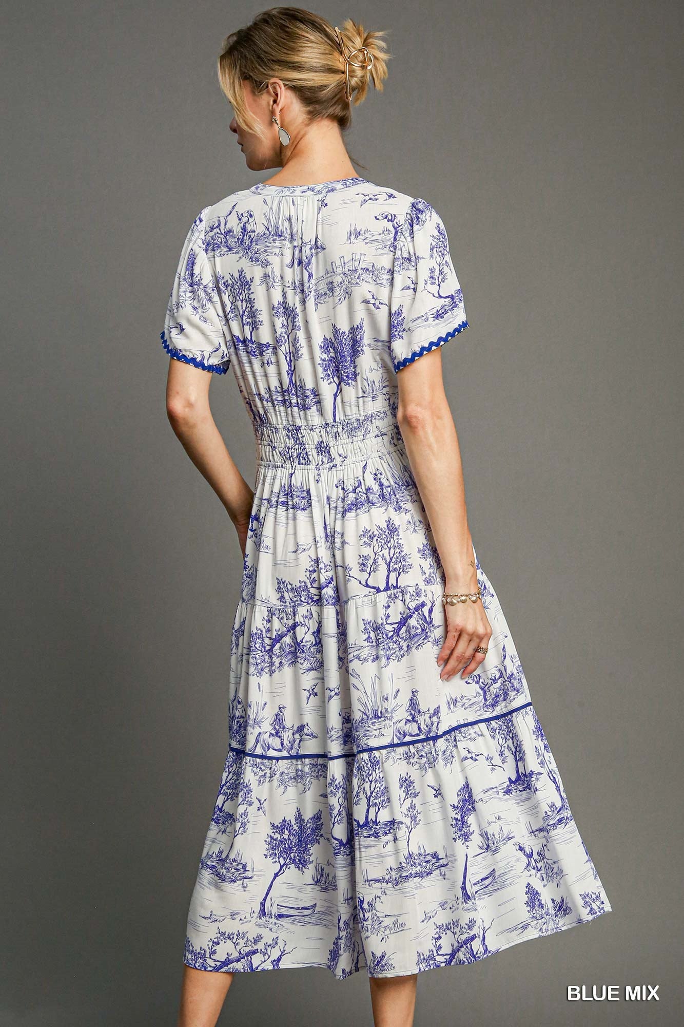 Short Sleeve Landscape Print Maxi Dress with Smocked Waist