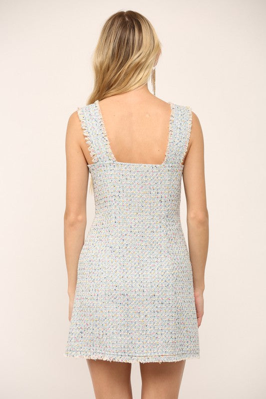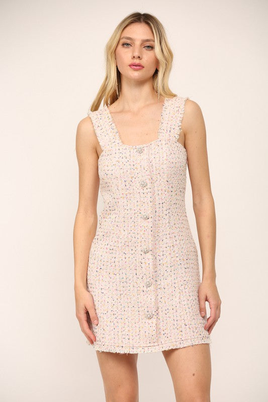 Sleeveless Frayed Edge Hem Mini Dress with Square Neckline ad Rhinestone Buttons