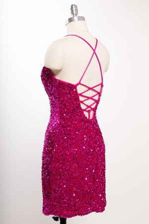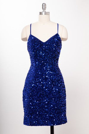 Spaghetti Strap Fitted Sequins Mini Dress with Corset Back Closure